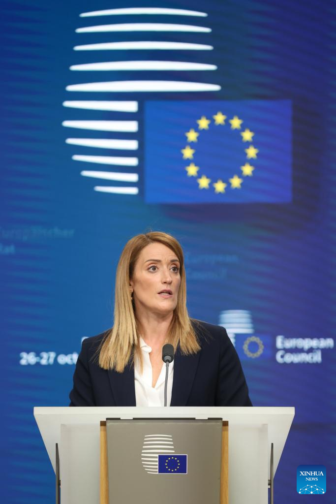 President of the European Parliament Roberta Metsola attends a press conference during the EU summit in Brussels, Belgium, on Oct. 26, 2023. European Union (EU) leaders meet here on Thursday and Friday in a planned European Council summit, focusing on the conflicts between Israel and Hamas and between Ukraine and Russia. (Xinhua/Zhao Dingzhe)