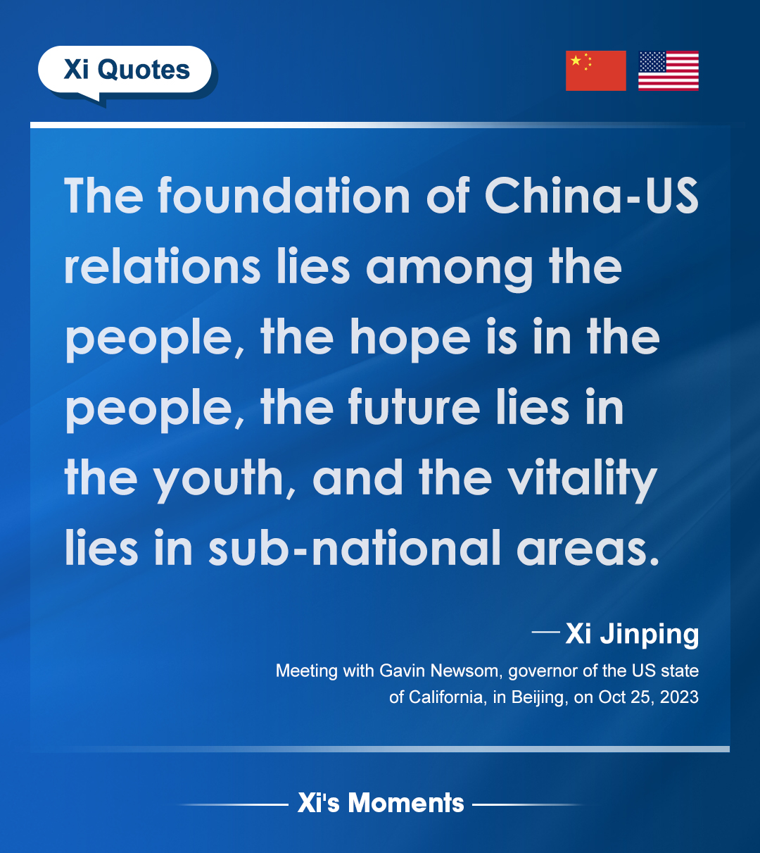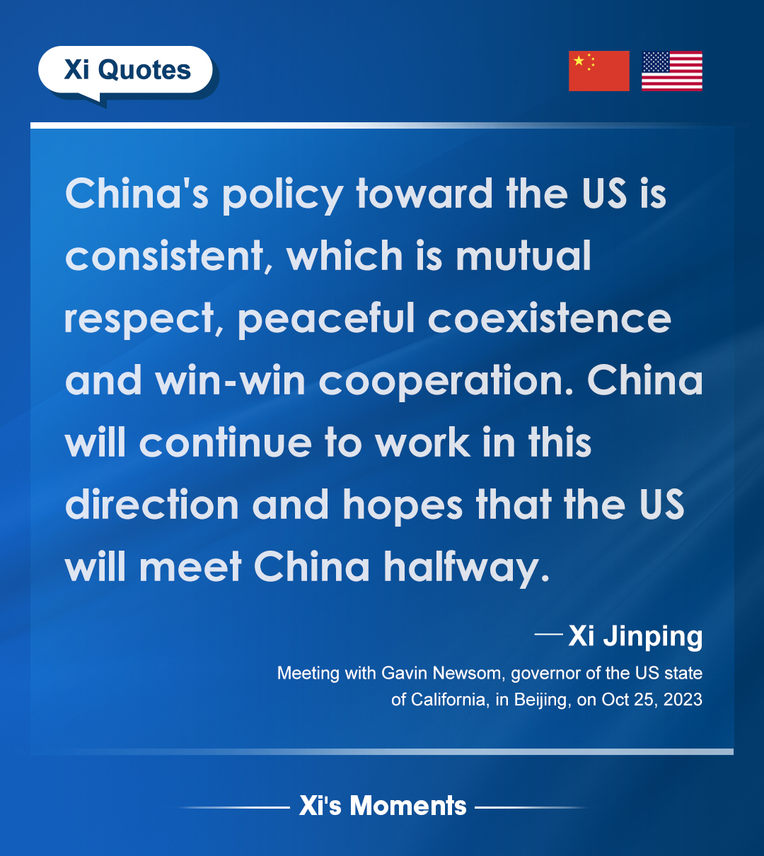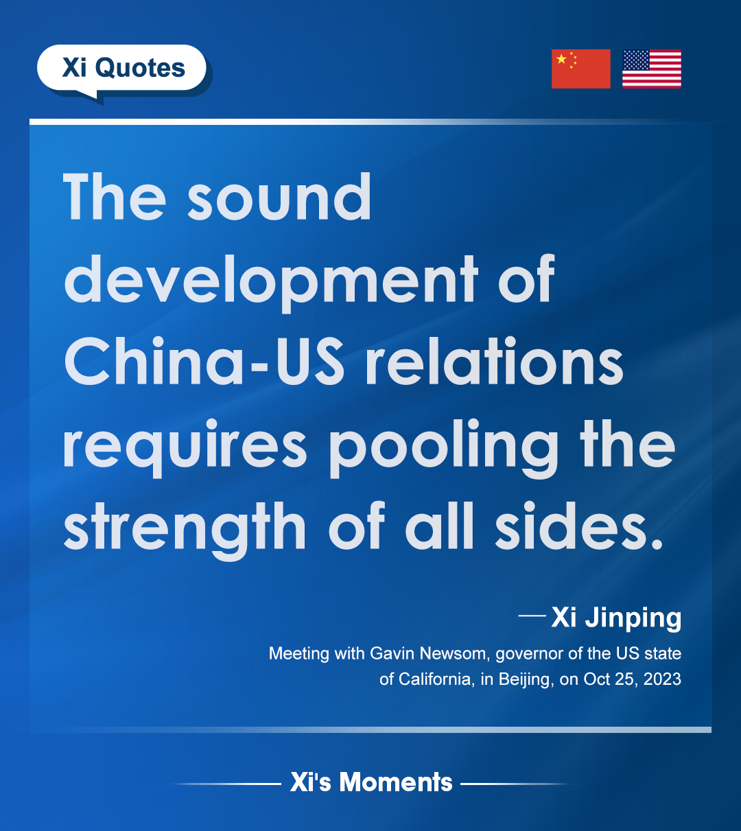 President Xi Jinping met with the governor of the US state of California on Wednesday to reaffirm Beijing's commitment to stronger bilateral ties amid growing diplomatic engagements between the two countries. Here are the highlights of his remarks.