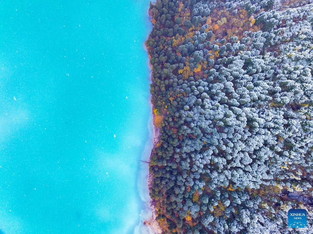 This aerial photo taken on Oct. 28, 2023 shows the autumn scenery of a canyon after a snowfall in Gongbo'Gyamda County in Nyingchi City, southwest China's Tibet Autonomous Region. (Xinhua/Jiang Fan)