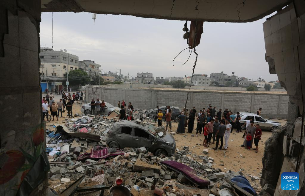 People are seen among the rubble of buildings destroyed in Israeli airstrikes in the southern Gaza Strip city of Rafah, Oct. 29, 2023. The death toll of Palestinians from Israeli strikes on the Gaza Strip rose to 8,005, including 3,342 children, the Hamas-run Health Ministry said on Sunday.