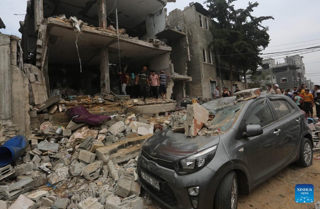 People conduct rescue work among the rubble of buildings destroyed in Israeli airstrikes in the southern Gaza Strip city of Rafah, Oct. 29, 2023. The death toll of Palestinians from Israeli strikes on the Gaza Strip rose to 8,005, including 3,342 children, the Hamas-run Health Ministry said on Sunday.