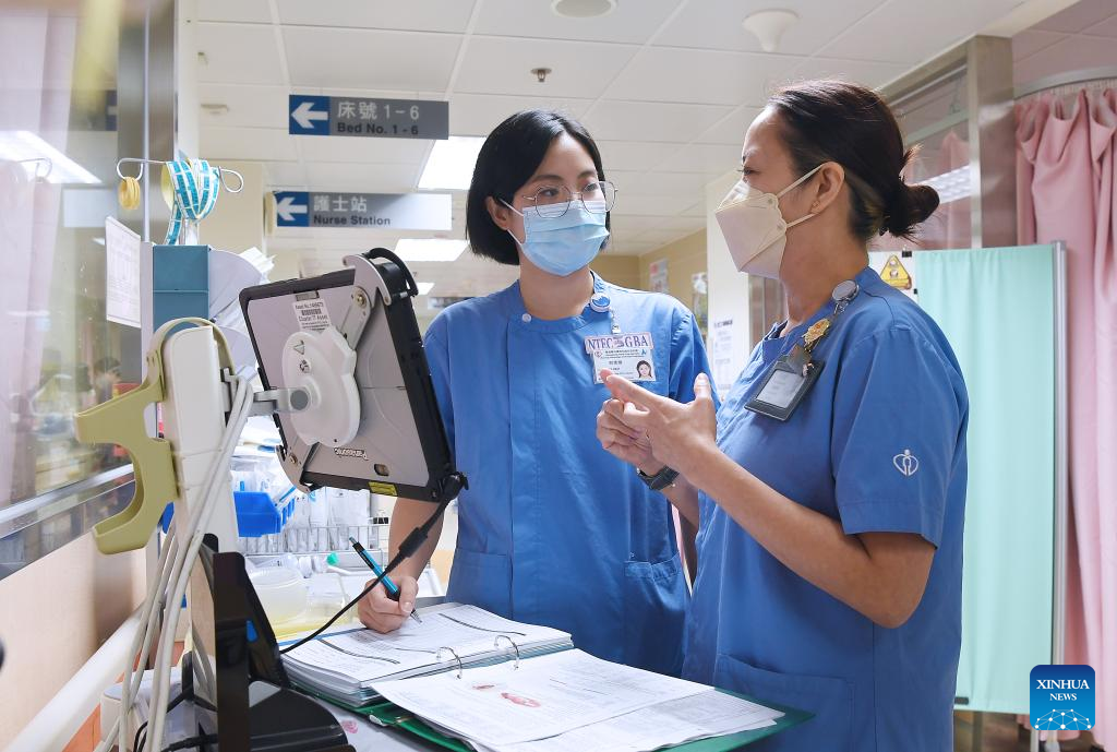 Liu Jiali (L) and Savina Sze work in a ward at Prince of Wales Hospital in south China's Hong Kong, Oct. 18, 2023. (Xinhua/Chen Duo)