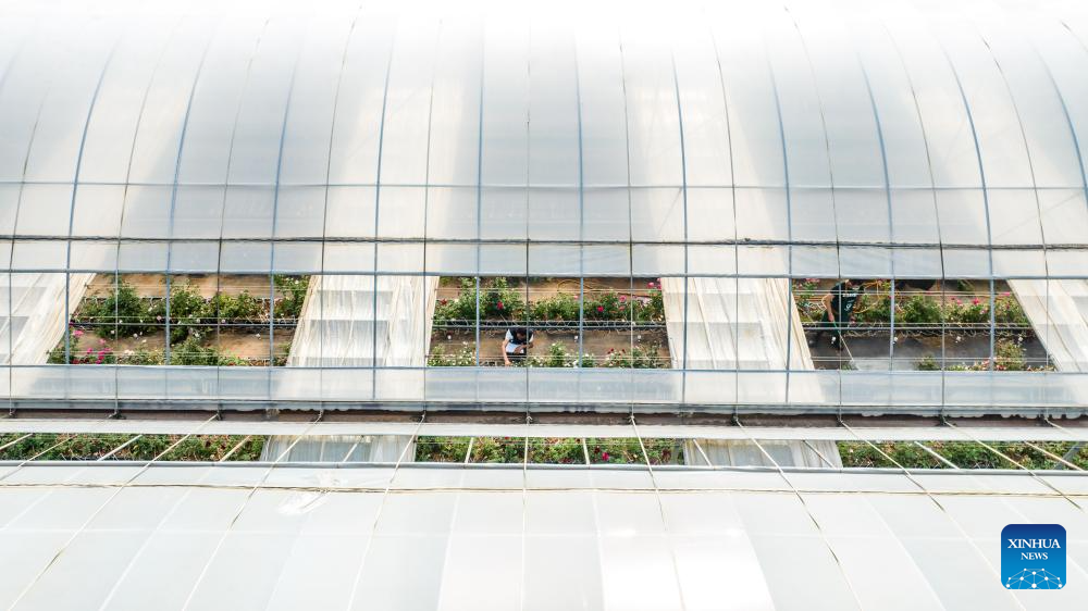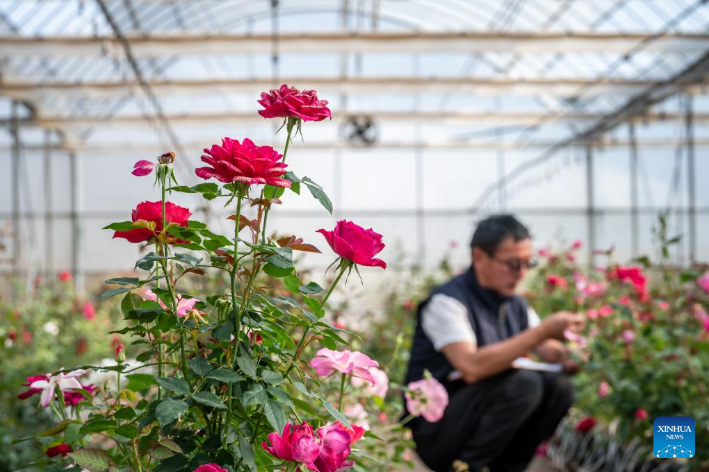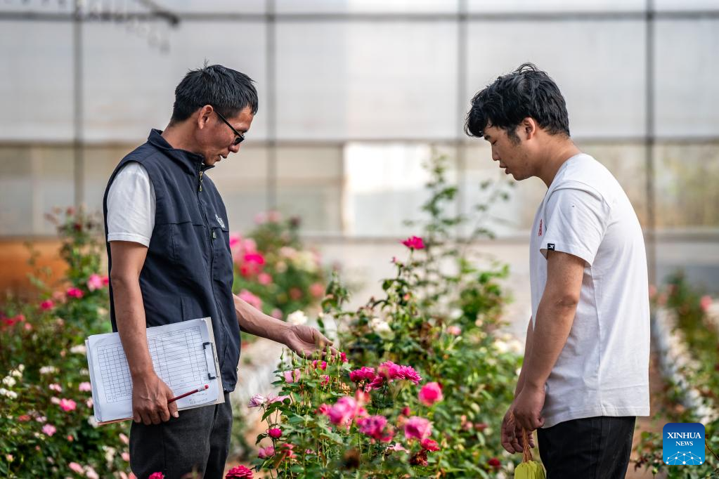 Tian Liantong checks roses at a roses plantation demonstration garden of a modern agricultural park in Anning City, southwest China's Yunnan Province on Oct. 20, 2023. (Xinhua/Hu Chao)