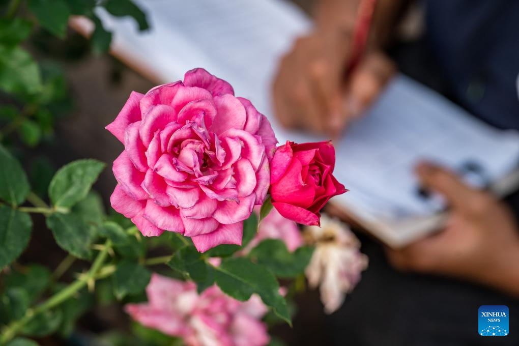 Tian Liantong takes notes of the serial numbers of roses at a roses plantation demonstration garden of a modern agricultural park in Anning City, southwest China's Yunnan Province on Oct. 20, 2023. (Xinhua/Hu Chao)
