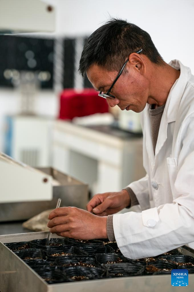 Tian Liantong breeds seeds brought back from space at a lab in Anning City, southwest China's Yunnan Province on April 3, 2023. (Xinhua/Hu Chao)