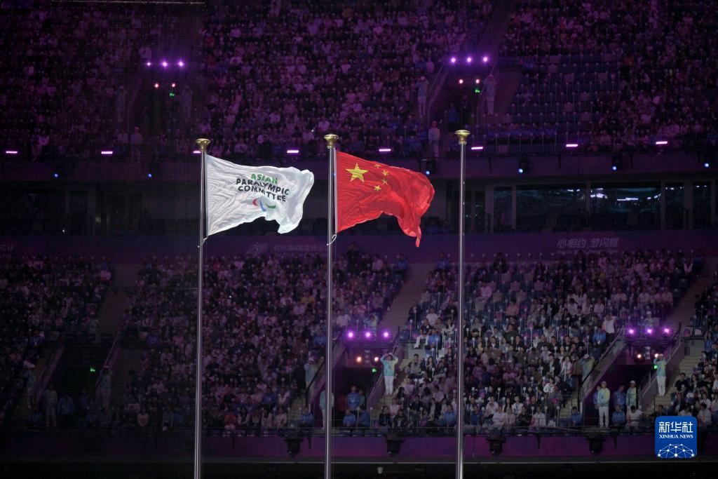 The flag of the Asian Paralympic Committee and the national flag of the People's Republic of China are raised during the closing ceremony of the 4th Asian Para Games held at the Hangzhou Olympic Sports Center Stadium in Hangzhou, East China's Zhejiang province, Oct 28, 2023. [Photo/Xinhua]
