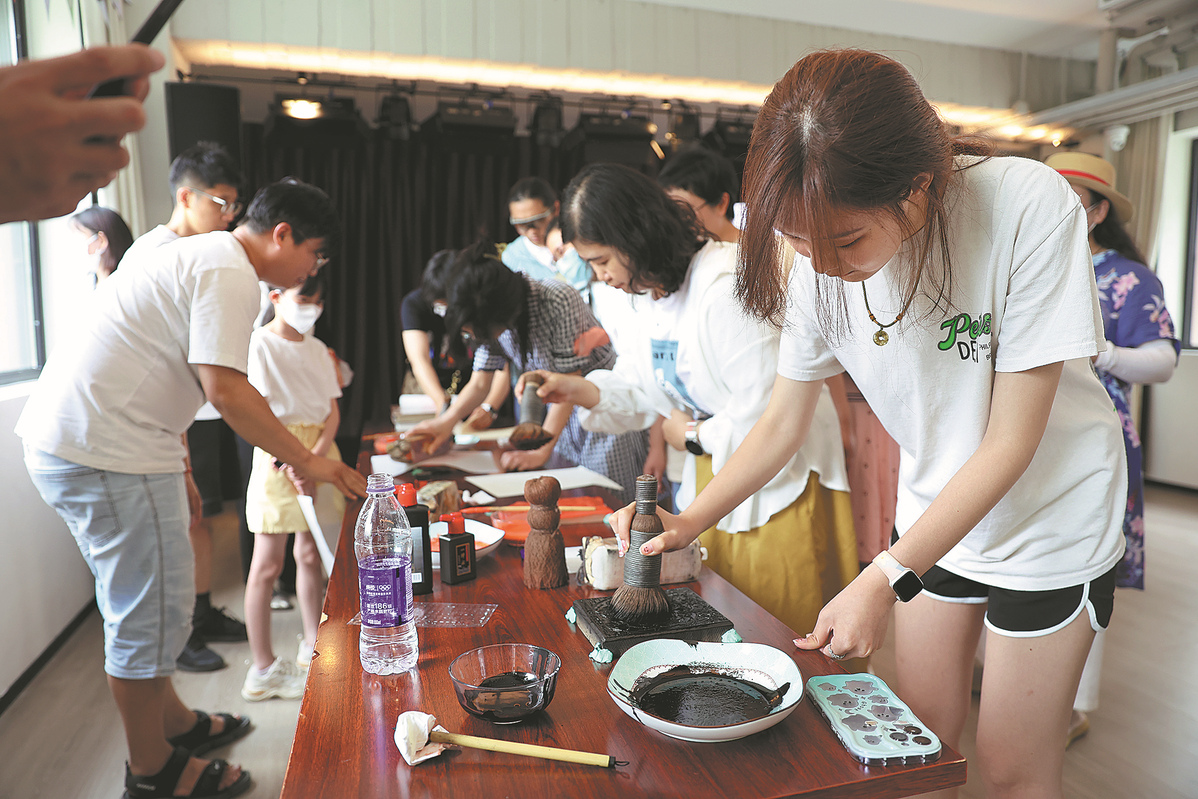 Visitors experience traditional woodblock printing at the park. [Photo/China Daily]
