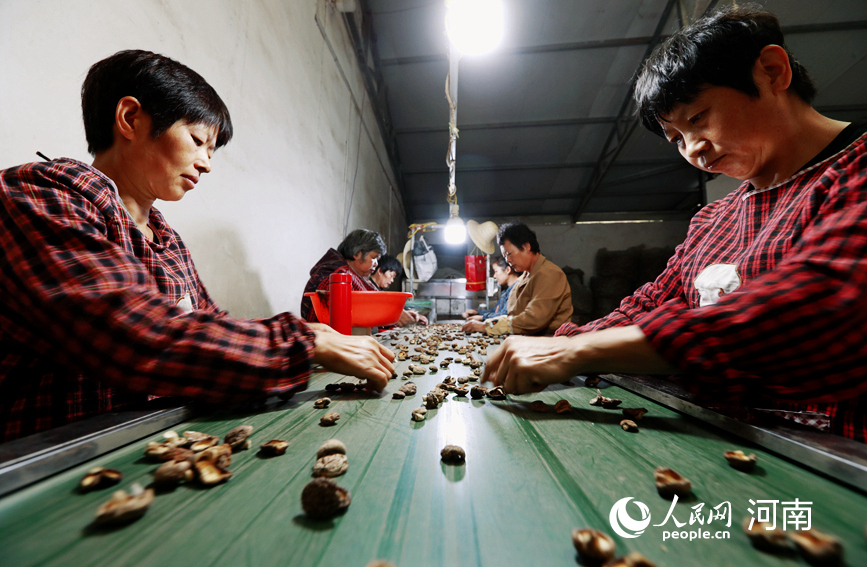 Photo shows workers at a shiitake mushroom processing company in Xixia county, central China’s Henan Province. (People’s Daily Online/Huo Yaping)