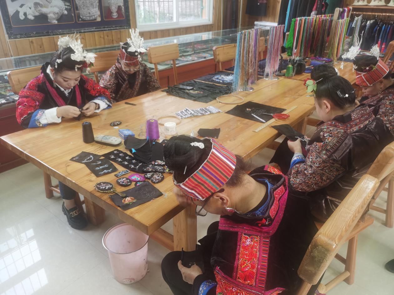 Villagers craft embroidery accessories in Shidong town, Taijiang county, southwest China's Guizhou Province, Oct. 28, 2023. (People's Daily Online/Yang Qian)