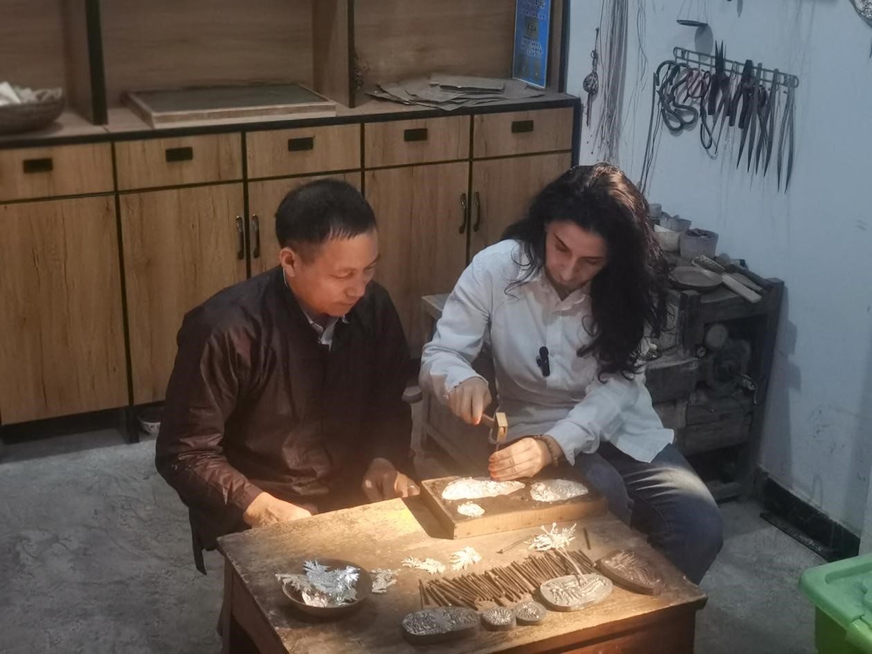The Miao community is renowned for its embroidery and silver accessories. Georgian journalist Catherine Gulua and Kazakhstani journalist Arsen Nurtazin tried traditional Miao attire, sharing their experiences through videos on social media. The journalists also toured a silversmith's workshop to learn how to make silver jewelry.