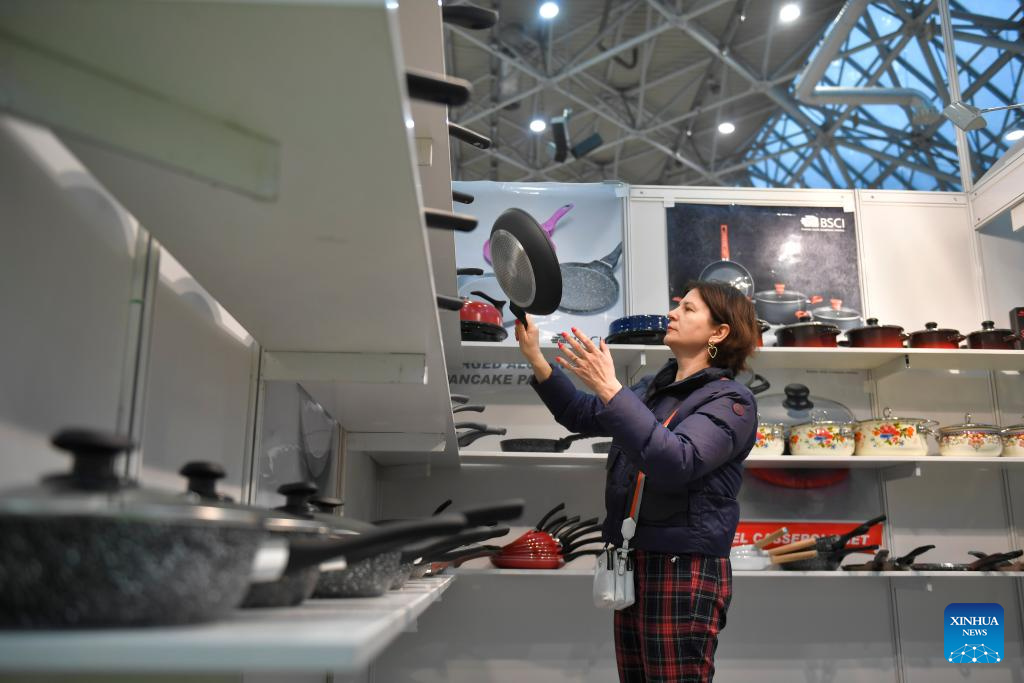 A visitor checks exhibits during the 7th China Commodity Fair in Moscow, Russia, on Oct. 30, 2023. This event is held here from Oct. 30 to Nov. 1. (Photo by Alexander Zemlianichenko Jr/Xinhua)
