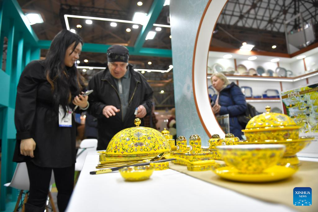 Visitors look at porcelain products during the 7th China Commodity Fair in Moscow, Russia, on Oct. 30, 2023. This event is held here from Oct. 30 to Nov. 1. (Photo by Alexander Zemlianichenko Jr/Xinhua)