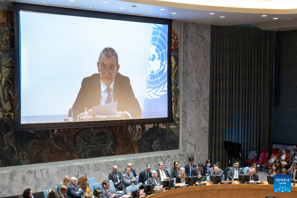 Philippe Lazzarini (on the screen), the commissioner-general of the UN Agency for Palestine Refugees (UNRWA), speaks at a UN Security Council meeting via a video link at the UN headquarters in New York, on Oct. 30, 2023. (Eskinder Debebe/UN Photo/Handout via Xinhua)