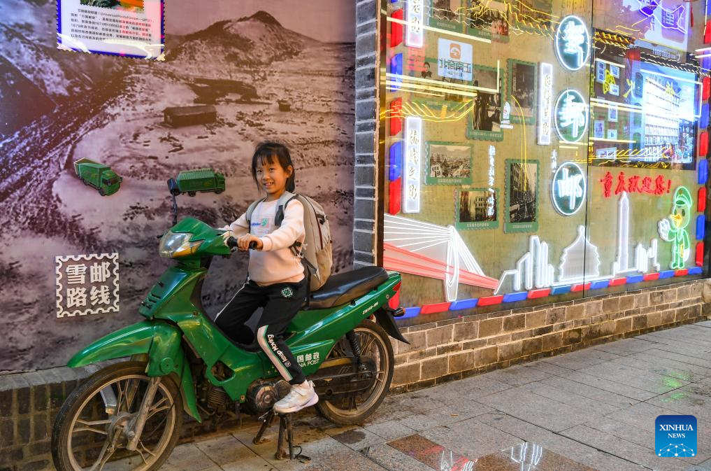 A child poses for photos on Duyou Street in southwest China's Chongqing Oct. 29, 2023. Duyou Street, an ancient street named after a postal service administration in the Qing Dynasty (1644-1911), has been renovated into a popular tourist destination featuring postal culture. (Xinhua/Wang Quanchao)
