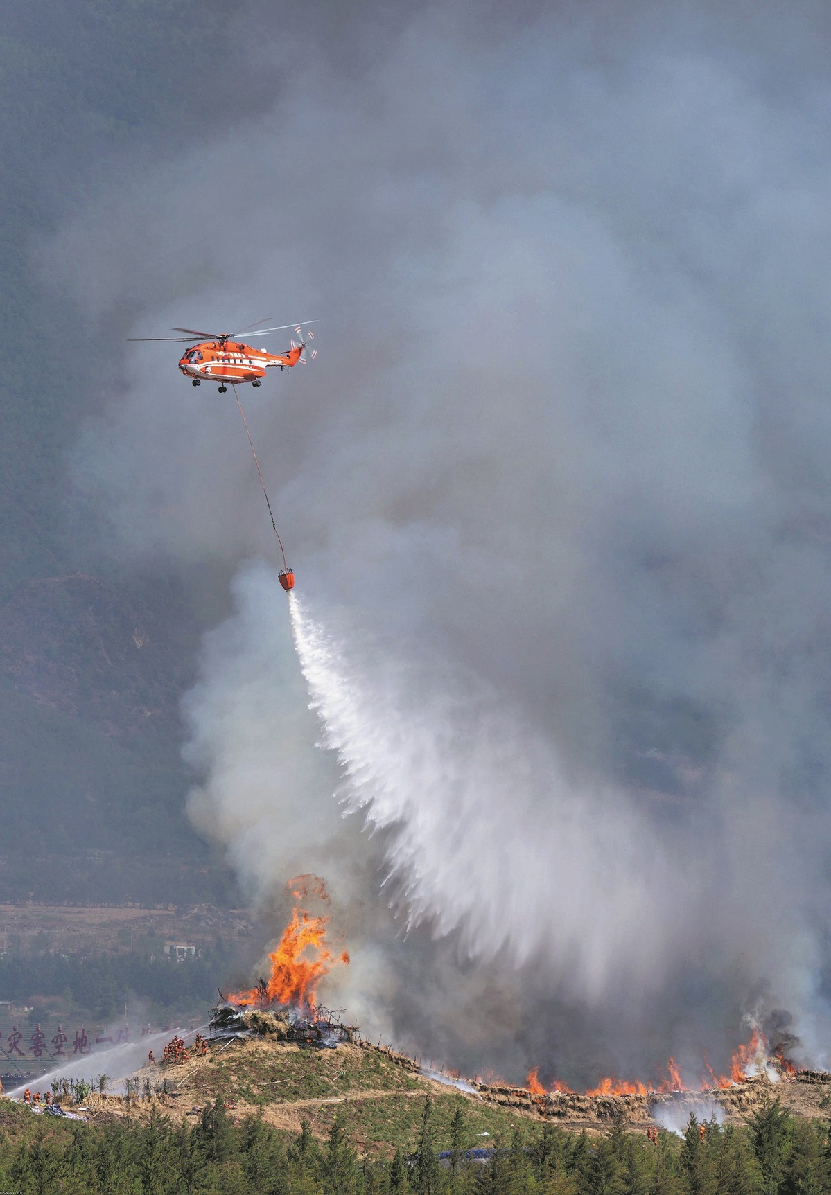 A Z-8A helicopter extinguishes a fire during a drill on May 16. [Photo by Yue Shuhua/For China Daily]