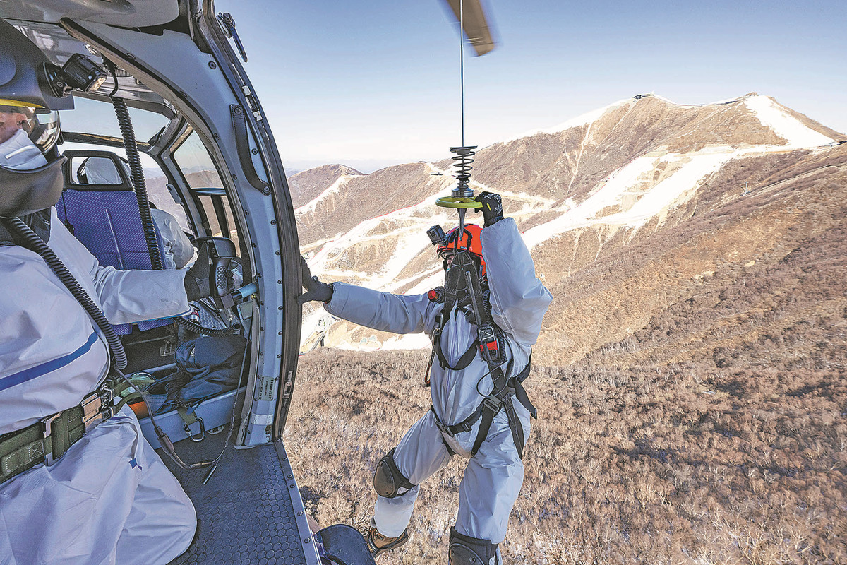 Rescuers practice a cable drop from a helicopter to retrieve injured during the Beijing Winter Olympic Games. [Photo by Feng Yongbin/China Daily]