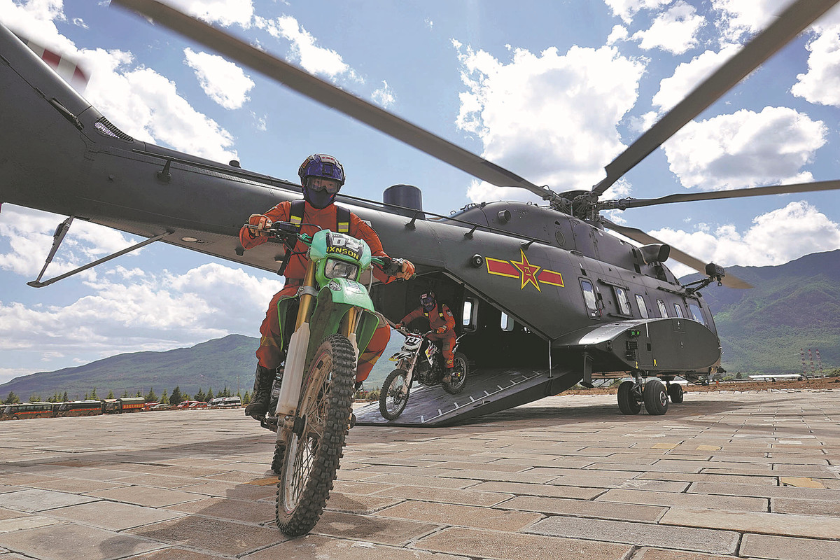 Rescue workers ride motorcycles off a Z-8L helicopter during a rescue drill held in Lijiang, Yunnan province, on May 16. [Photo by Li Yanxuan/For China Daily]