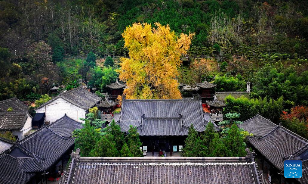 This photo taken on Oct. 31, 2023 shows a ginkgo tree in a temple in Xi'an, northwest China's Shaanxi Province. (Xinhua/Liu Xiao)
