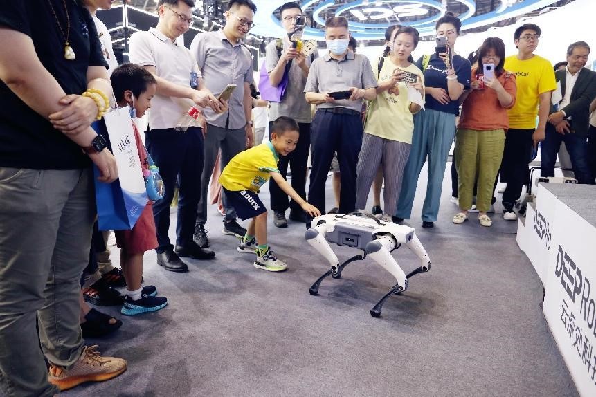 Photo shows a child playing with a robot dog at the 2023 World Artificial Intelligence Conference, which kicks off at the Shanghai World Expo Exhibition and Convention Center on July 6, 2023. (People's Daily Online/Chen Yuyu)