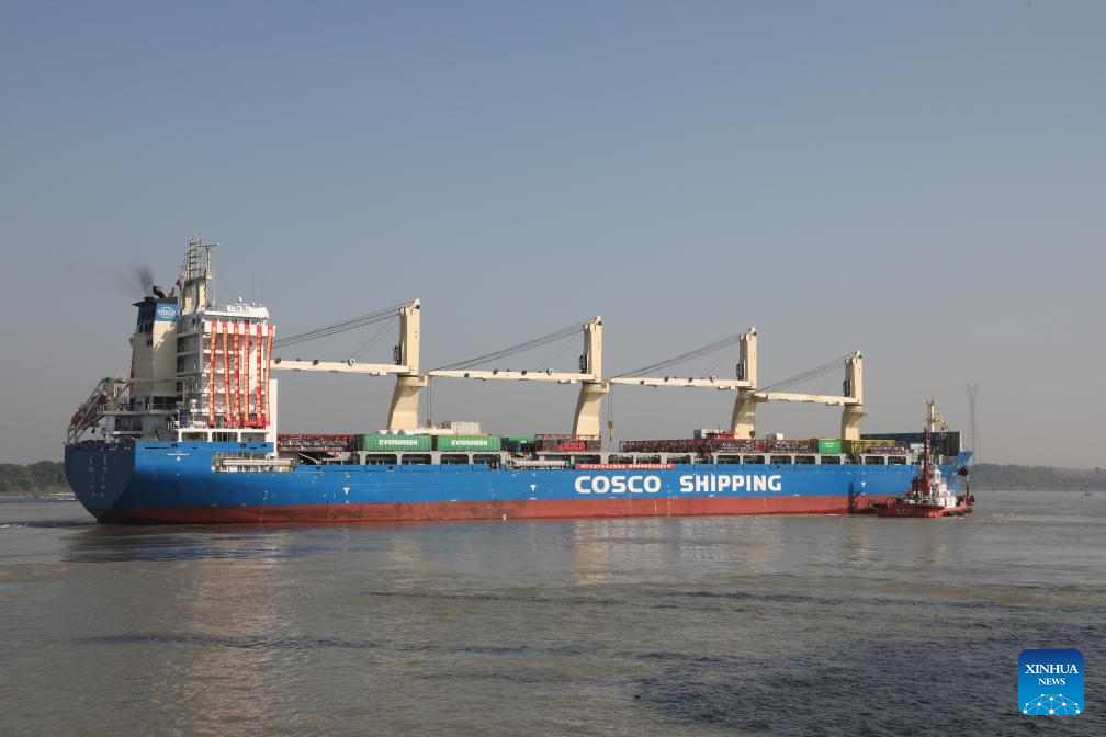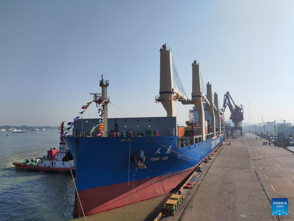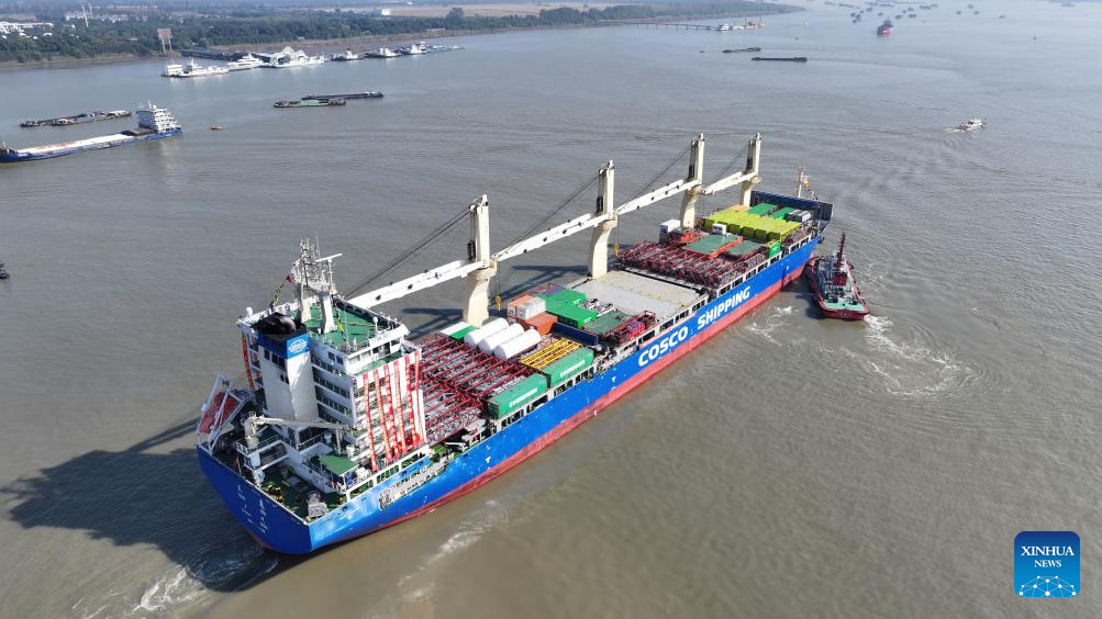 Cargo vessel Tian Hui sets off from Zhangjiagang, east China's Jiangsu Province, Nov. 1, 2023. (Photo by He Haiyang/Xinhua)