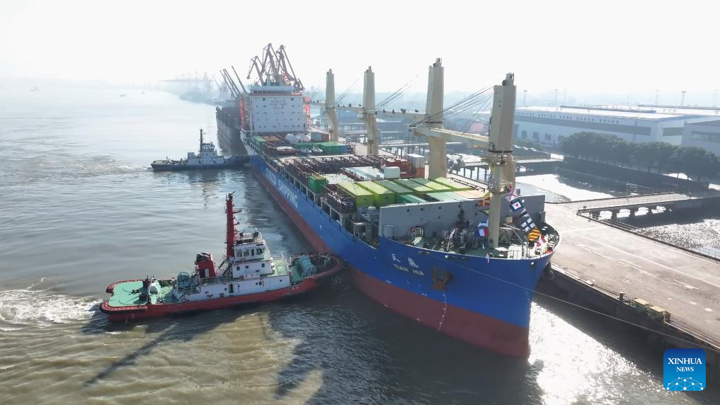 This photo taken on Nov. 1, 2023 shows cargo vessel Tian Hui ready to set off from Zhangjiagang, east China's Jiangsu Province. (Photo by He Haiyang/Xinhua)