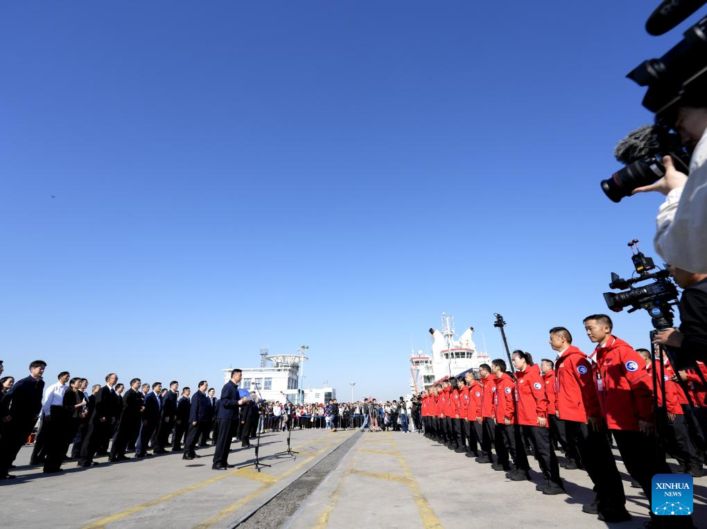This photo taken on Nov. 1, 2023 shows a set-off ceremony for China's 40th Antarctic scientific expedition team at a base dock in Shanghai, east China. (Xinhua/Zhang Jiansong)