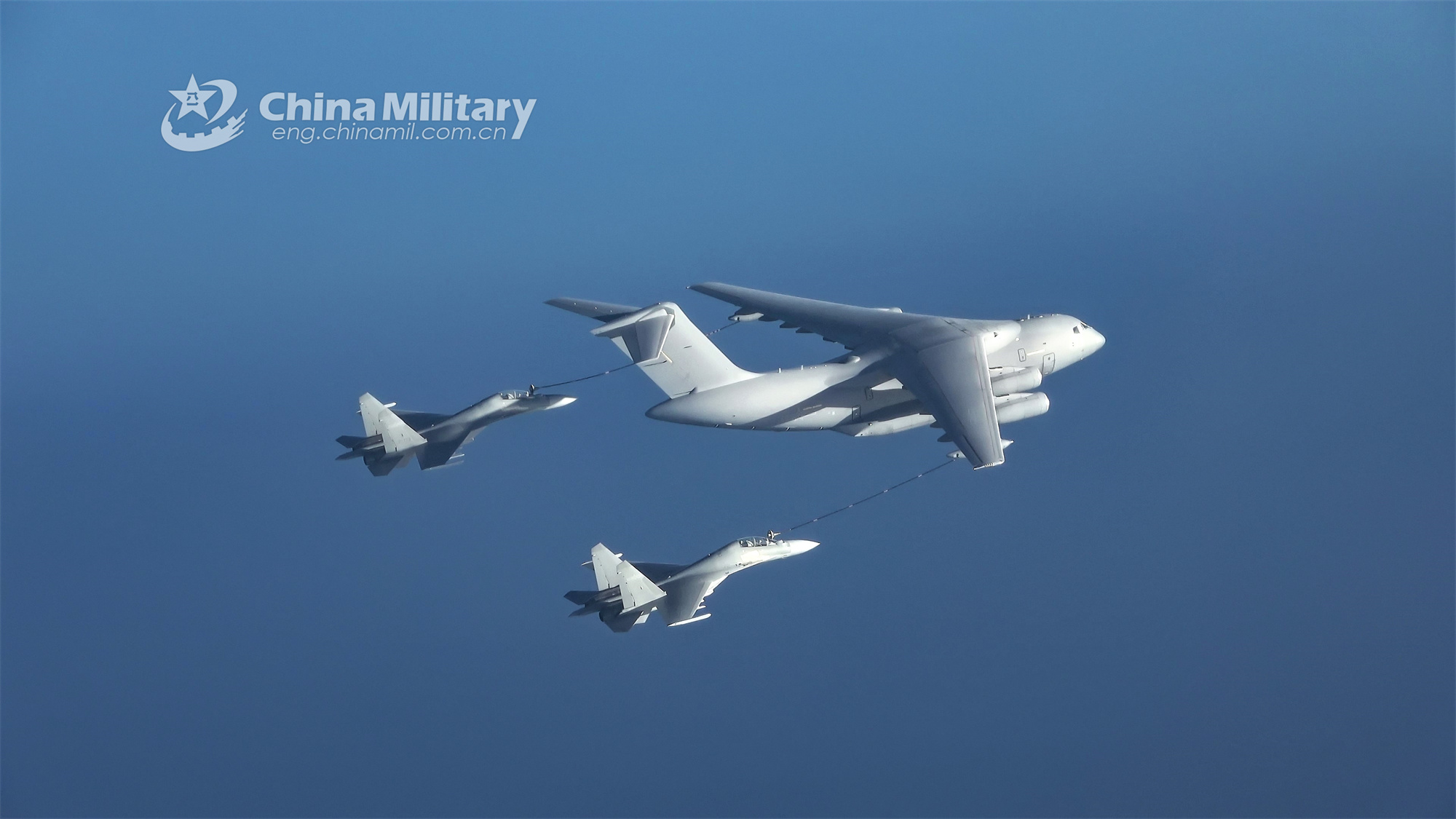 A tanker aircraft attached to an aviation brigade with the air force under the PLA Southern Theater Command refuels two fighter jets simultaneously in an aerial refueling mission during a long-endurance flight training exercise in mid October, 2023. (eng.chinamil.com.cn/Photo by Hao Hunan)