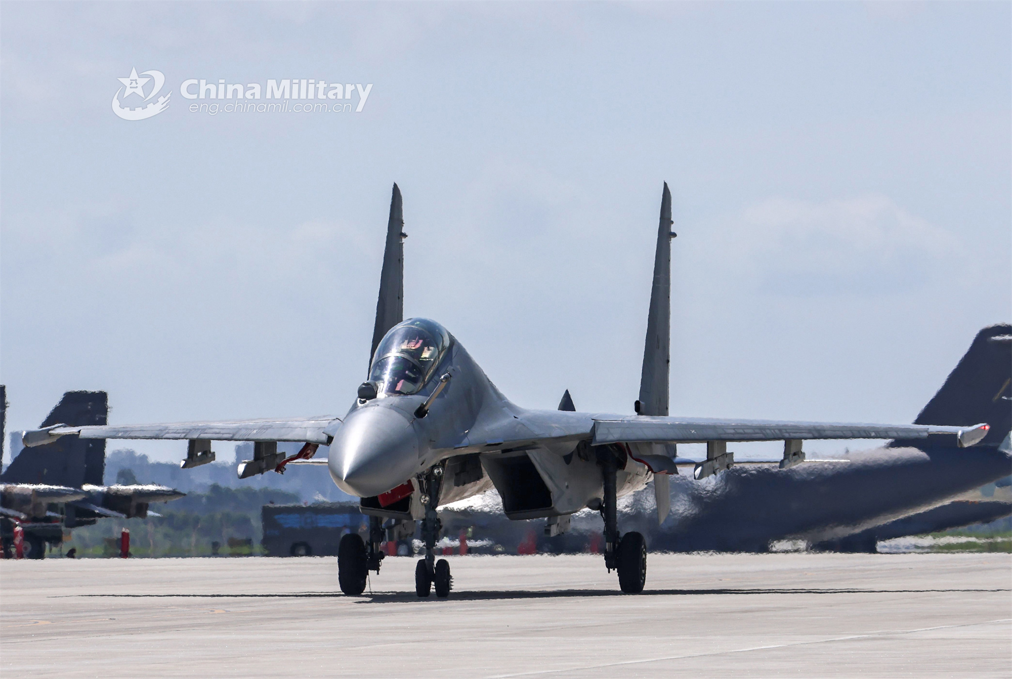 A fighter jet attached to an aviation brigade with the air force under the PLA Southern Theater Command taxies on the runway during a long-endurance flight training exercise in mid October, 2023. (eng.chinamil.com.cn/Photo by Hao Hunan)