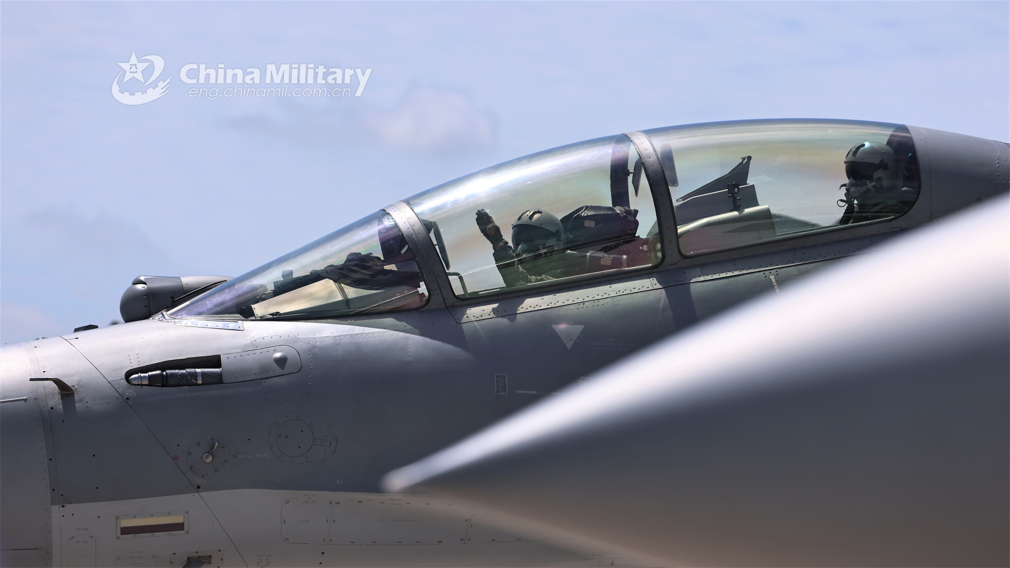 Pilots assigned to an aviation brigade with the air force under the PLA Southern Theater Command give gestures to the ground crew before takeoff during a long-endurance flight training exercise in mid October, 2023. (eng.chinamil.com.cn/Photo by Hao Hunan)
