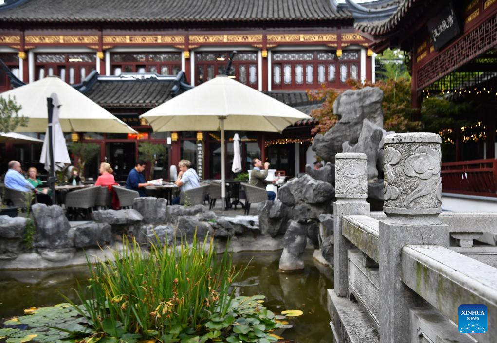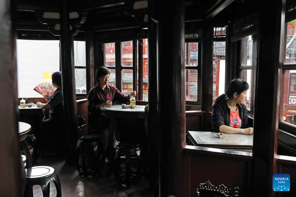 This photo taken on Oct. 12, 2023 shows tourists having tea at a teahouse in Yuyuan Garden of east China's Shanghai. (Xinhua/Liu Ying)