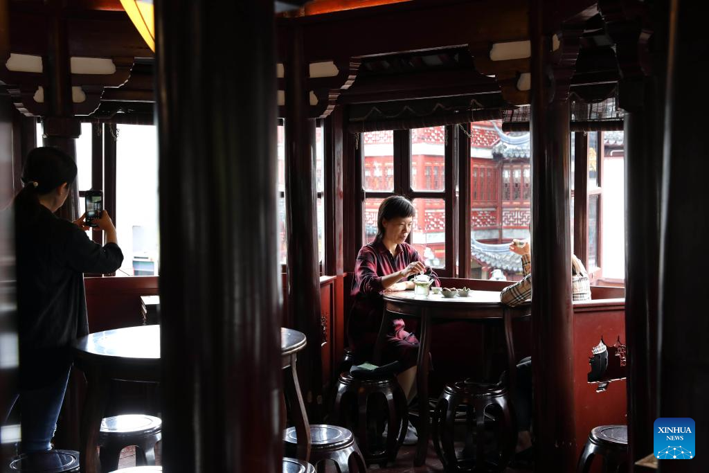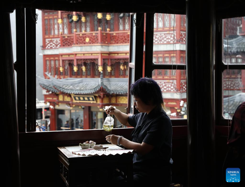 This photo taken on Oct. 12, 2023 shows a tourist having tea at a teahouse in Yuyuan Garden of east China's Shanghai. (Xinhua/Liu Ying)