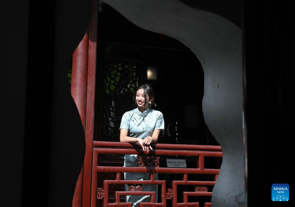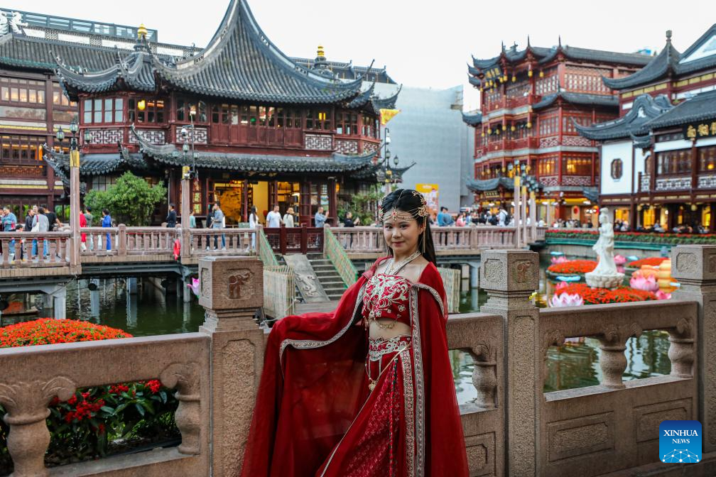 This photo taken on Oct. 11, 2023 shows a tourist posing for photos at Yuyuan Garden in east China's Shanghai. (Xinhua/Xin Mengchen)