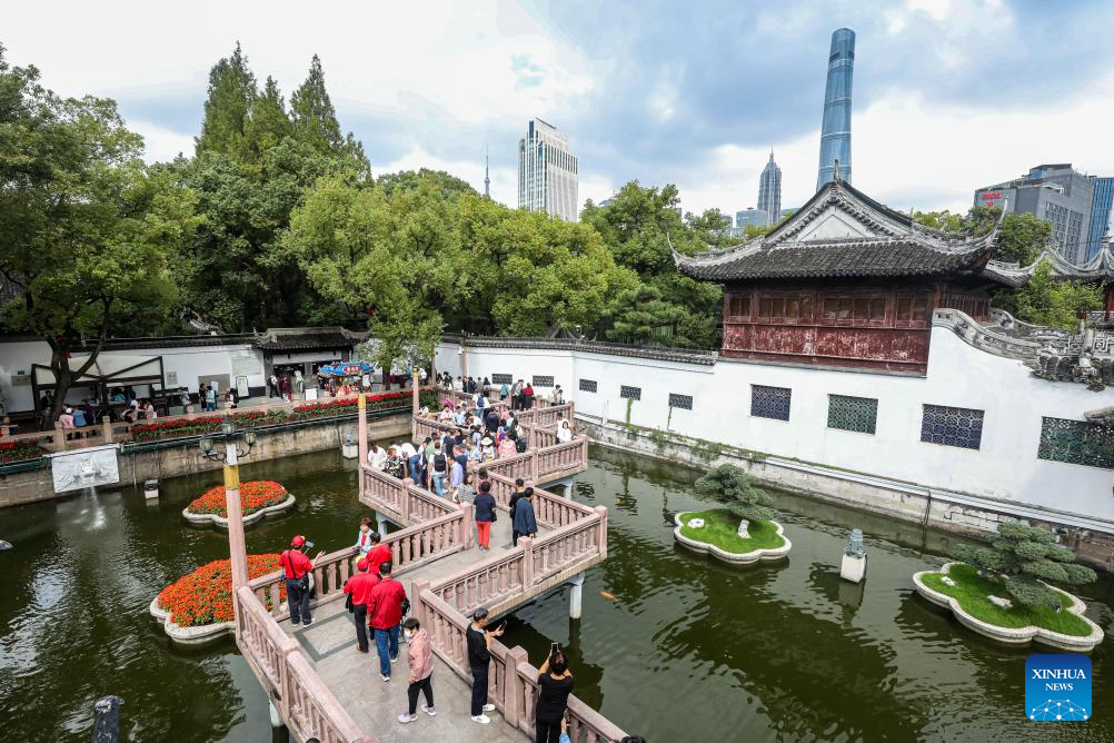 This photo taken on Oct. 12, 2023 shows people visiting Yuyuan Garden in east China's Shanghai. (Xinhua/Liu Ying)