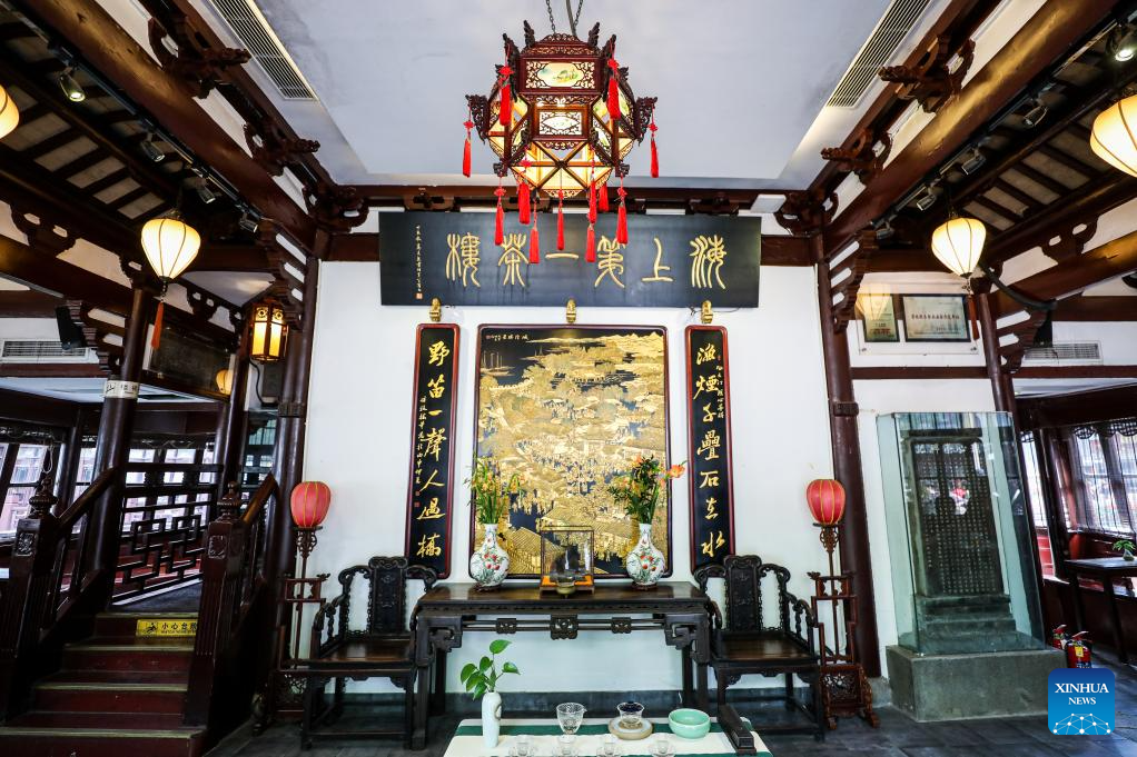 This photo taken on Oct. 12, 2023 shows the inner view of a teahouse at Yuyuan Garden in east China's Shanghai. (Xinhua/Xin Mengchen)