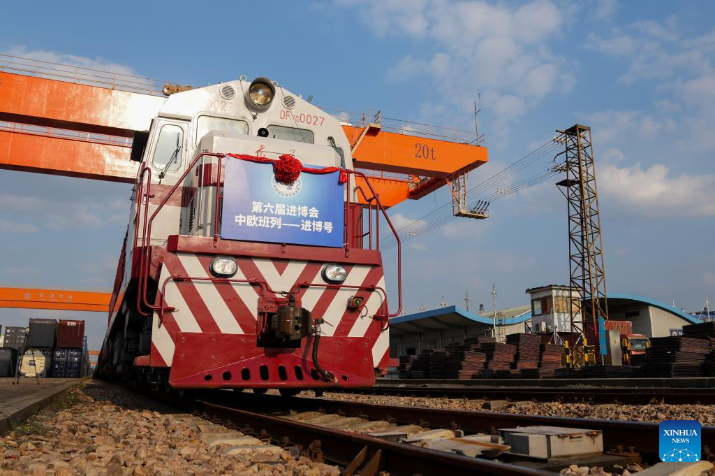 Two years ago, the first "Jinbo" (transliteration of the shortened name for the China International Import Expo, or CIIE) China-Europe freight train departed from Hamburg and arrived in Shanghai, the hosting city of CIIE, marking the first time for exhibits for the CIIE to be sent by the freight train to the municipality. This year, "Jinbo" train arrived in Shanghai for the third consecutive year, carrying exhibits for the upcoming 6th CIIE.