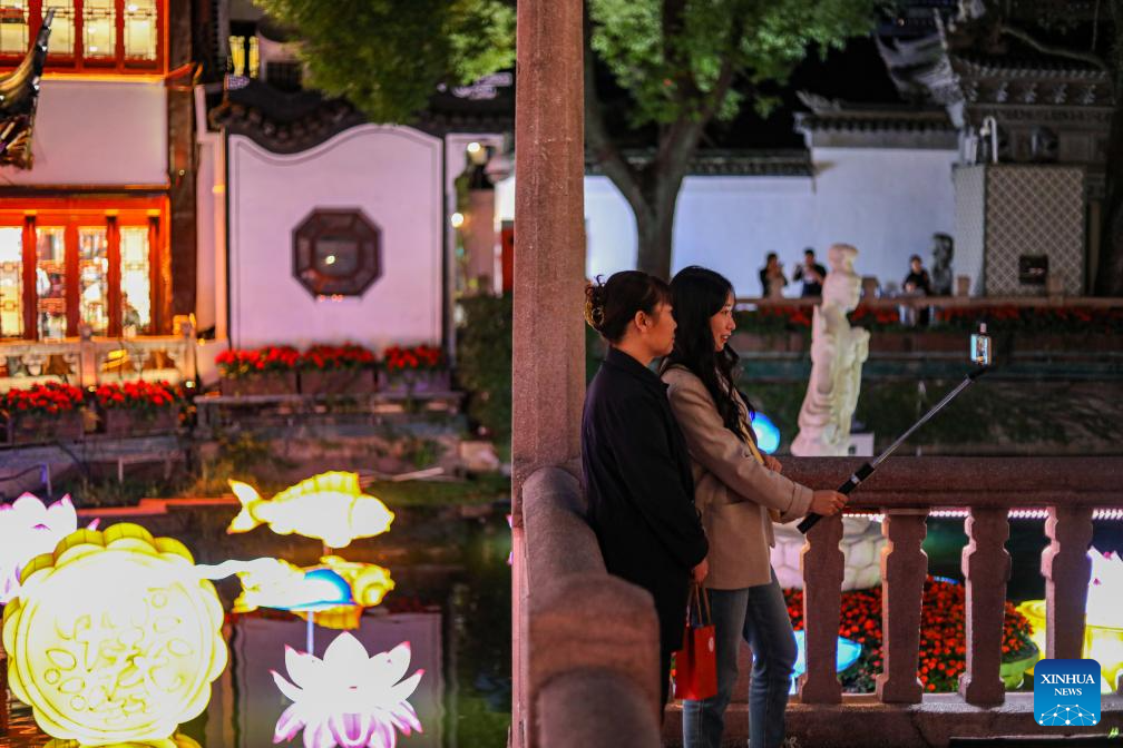 This photo taken on Oct. 11, 2023 shows tourists posing for pictures at Yuyuan Garden in east China's Shanghai. (Xinhua/Xin Mengchen)