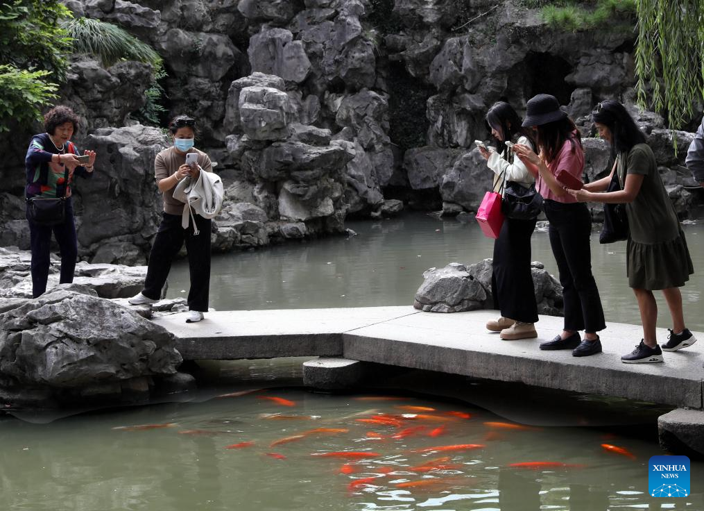This photo taken on Oct. 12, 2023 shows people taking pictures of koi fish at Yuyuan Garden in east China's Shanghai. (Xinhua/Liu Ying)