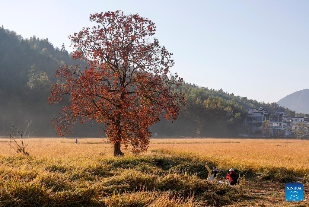 This photo taken on Nov. 1, 2023 shows the autumn view in Hongcun Town, Yixian County, Huangshan City, central China's Anhui Province. (Photo by Shi Yalei/Xinhua)