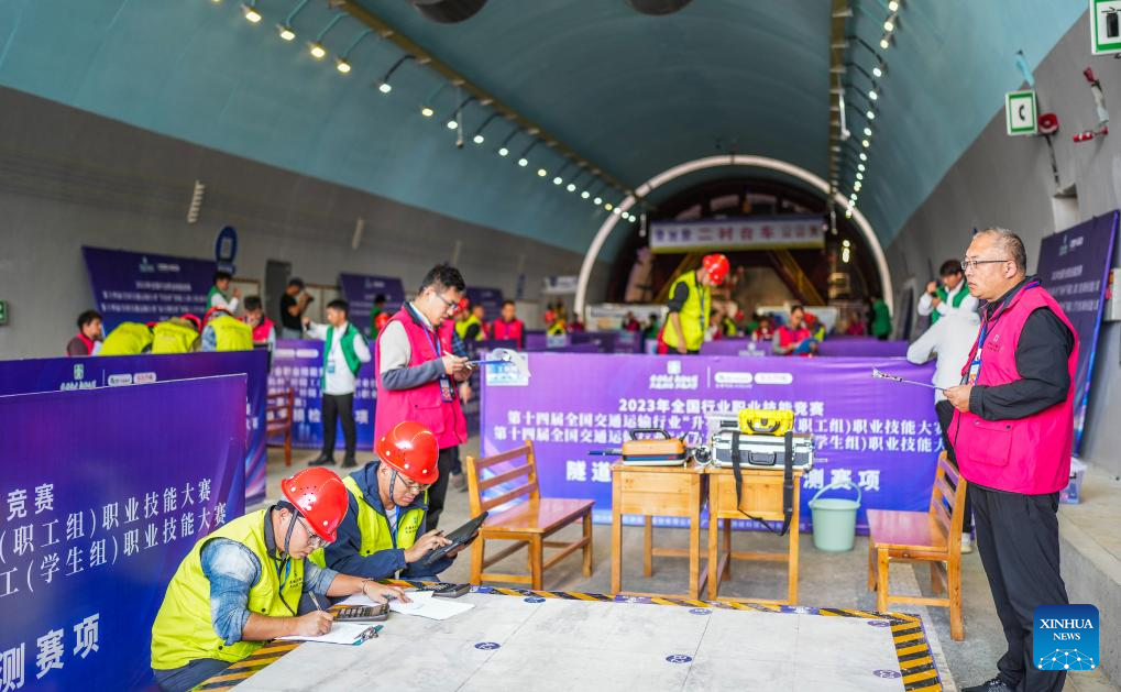 Contestants compete in tunnel lining defect non-destructive testing event during a national bridge and tunnel engineering vocational skills competition in Guiyang, southwest China's Guizhou Province, Nov. 1, 2023. A national bridge and tunnel engineering vocational skills competition kicked off here Wednesday. In total 214 contestants from 85 teams across China would compete in the four-day competition involving events like processing of framework of reinforcing steel bars and construction layout. (Xinhua/Tao Liang)