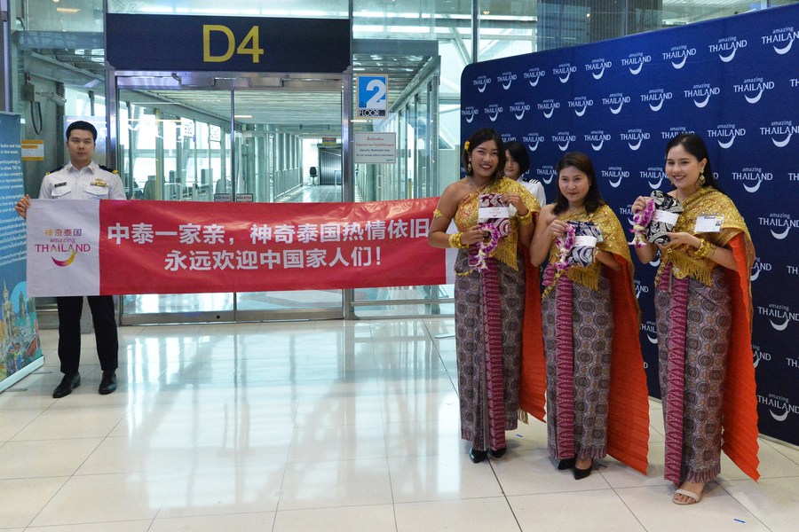 Staff members prepare to welcome Chinese tourists at Suvarnabhumi airport in Bangkok, Thailand, Sept. 25, 2023. (Xinhua/Rachen Sageamsak)