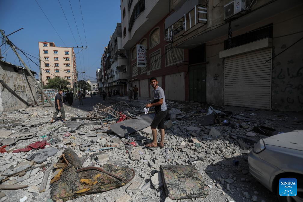 People inspect the damage after Israeli airstrikes in Gaza City, on Nov. 2, 2023. The Israel-Hamas conflict, raging for nearly a month, has led to the deaths of more than 9,000 Palestinians in Gaza. On the Israeli side, more than 1,400 people lost their lives, the vast majority in the Hamas attack on Oct. 7, which triggered the latest conflict. (Xinhua)