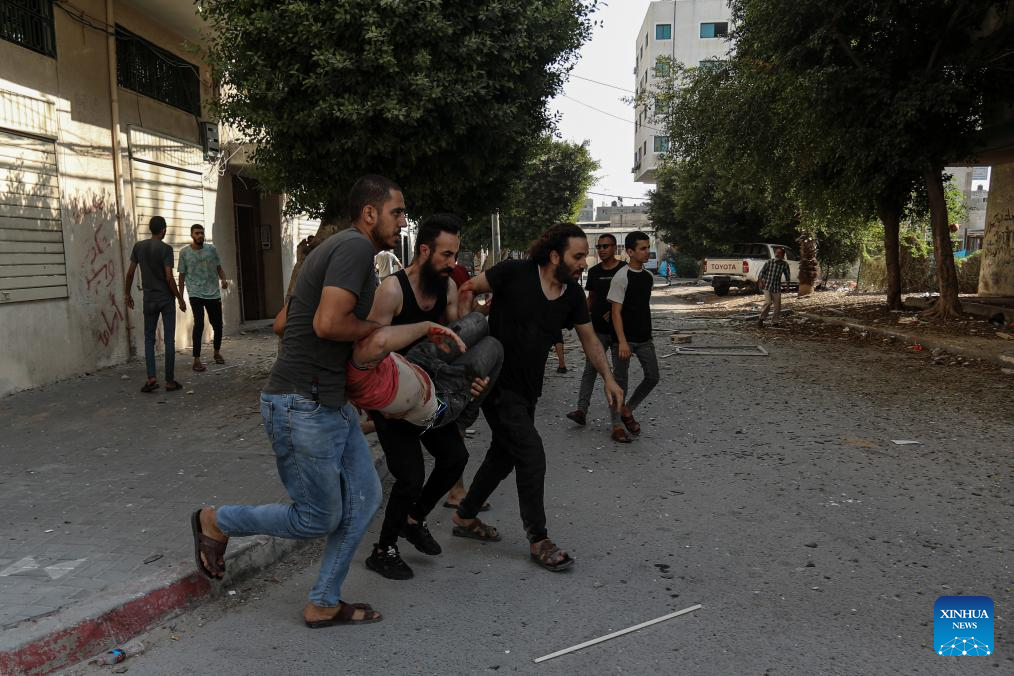 People transfer a man injured in an Israeli airstrike in Gaza City, on Nov. 2, 2023. The Israel-Hamas conflict, raging for nearly a month, has led to the deaths of more than 9,000 Palestinians in Gaza. On the Israeli side, more than 1,400 people lost their lives, the vast majority in the Hamas attack on Oct. 7, which triggered the latest conflict. (Xinhua)