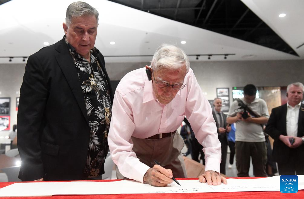 Flying Tigers veteran Harry Moyer signs when visiting a history museum of the resistance war against Japanese aggression in Liuzhou, south China's Guangxi Zhuang Autonomous Region, Nov. 4, 2023. Jeffrey Greene, chairman of the Sino-American Aviation Heritage Foundation, and Flying Tigers veterans and descendants arrived in Liuzhou on Saturday for a two-day visit. (Xinhua/Lu Boan)