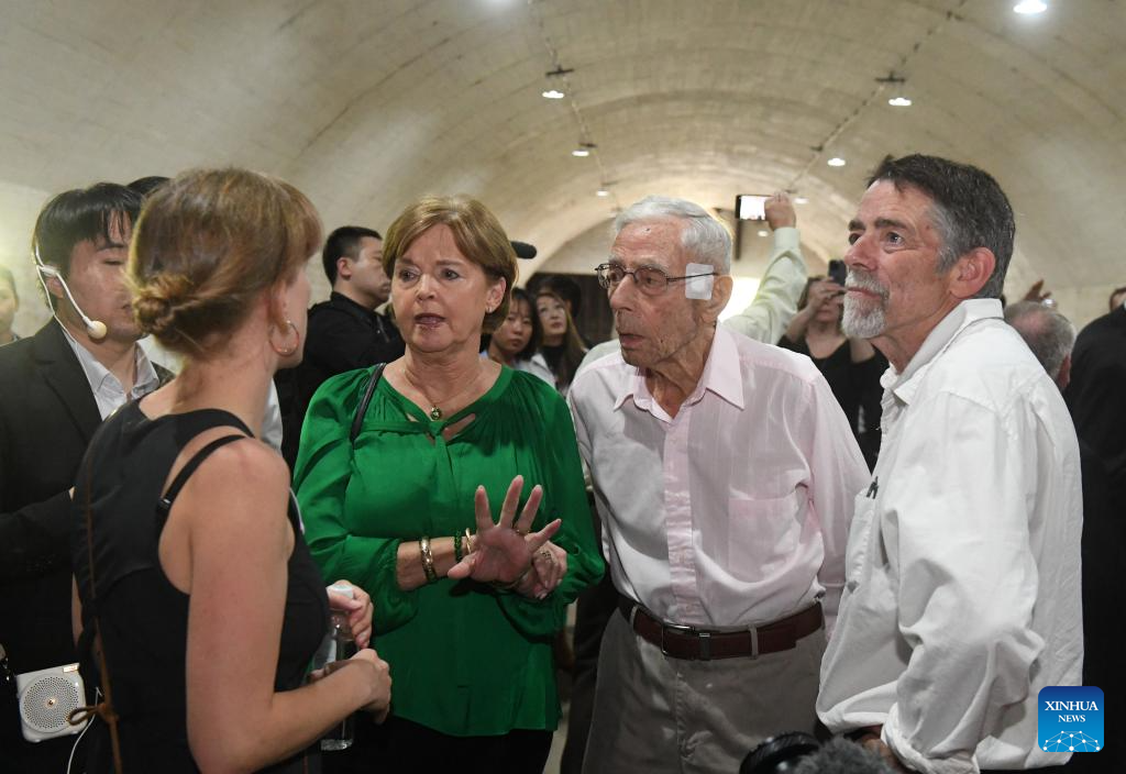 Nell Chennault Calloway (L), granddaughter of U.S. General Claire Lee Chennault, who led the wartime Flying Tigers pilots to fight Japanese invaders in China during WWII, and Flying Tigers veteran Harry Moyer visit a history museum of the resistance war against Japanese aggression in Liuzhou, south China's Guangxi Zhuang Autonomous Region, Nov. 4, 2023. Jeffrey Greene, chairman of the Sino-American Aviation Heritage Foundation, and Flying Tigers veterans and descendants arrived in Liuzhou on Saturday for a two-day visit. (Xinhua/Lu Boan)