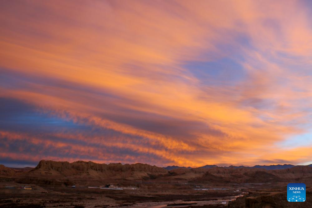 This photo taken on Nov. 3, 2023 shows the landscape of earth forest during dawn in Zanda County of Ngari Prefecture, southwest China's Tibet Autonomous Region. Zanda is famous for the unique landscape of earth forest. With gullies, ravines and steep mountainsides, the unique landscape was shaped as a result of gradual geological movements of the Himalayan region ever since the Quaternary Period from 2.5 million years ago and the impact of perennial water erosion and airslaking. (Xinhua/Chen Shangcai)