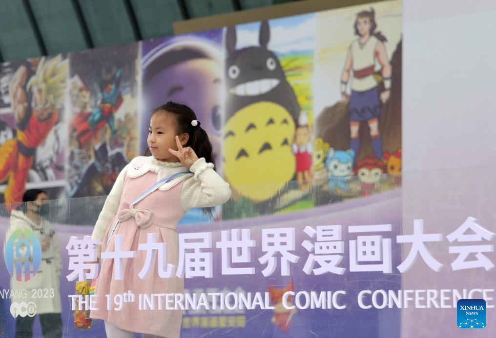A girl poses for a photo during the 19th World Comic Conference in Anyang, central China's Henan Province, Nov. 4, 2023. The five-day 19th World Comic Conference kicked off here on Saturday with 2,931 comic works from 29 countries and regions on display. (Xinhua/Li Jianan)