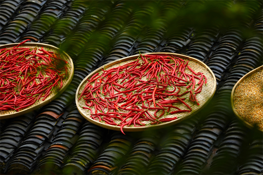 Crops are spread and dried openly under the sun in the Dayuwan Scenic Area, in Huangpi district of Wuhan in central China's Hubei Province. (Photo/Huang Xuan)