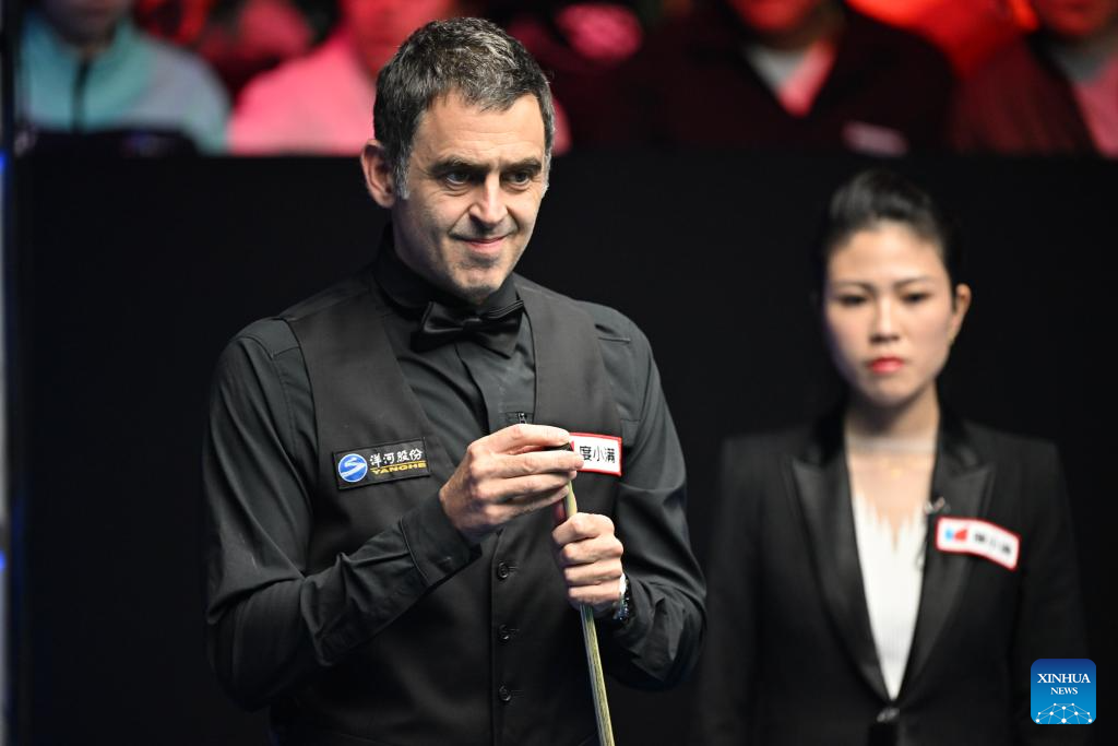 Ronnie O'Sullivan (L) of England reacts during the round 1 match between Ronnie O'Sullivan of England and Ken Doherty of Ireland at World Snooker International Championship 2023 in north China's Tianjin Municipality, Nov. 5, 2023. (Xinhua/Li Ran)