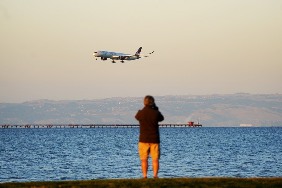 A plane is about to land in San Francisco International Airport in San Francisco, the United States, July 15, 2023. (Xinhua/Wu Xiaoling)