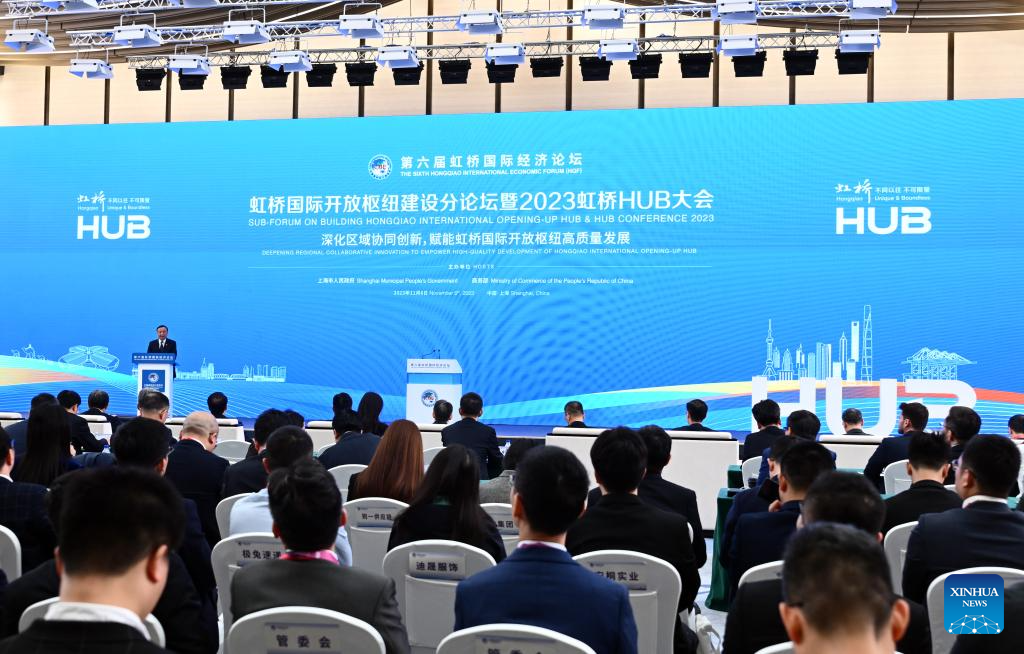The sub-forum on Building Hongqiao International Opening-up Hub & Hub Conference 2023 of the sixth Hongqiao International Economic Forum is held in Shanghai, east China, Nov. 6, 2023. (Xinhua/Jin Liangkuai)